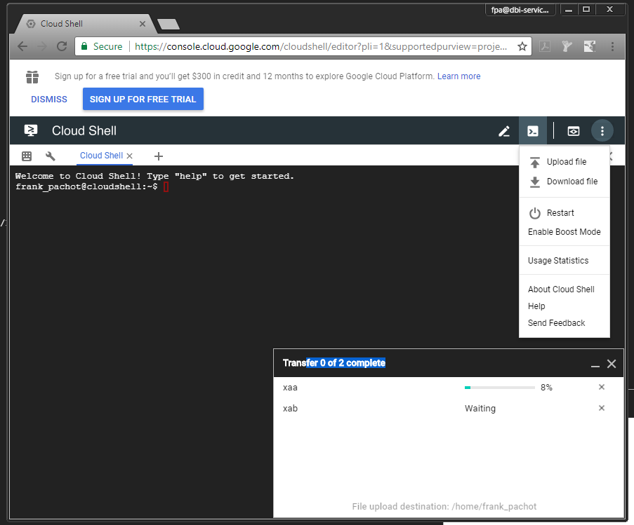 You can try to upload it to the Cloud Shell directly (menu on top right – upload file) but I had problems with the size of the file, so I’ve split it into two files:
