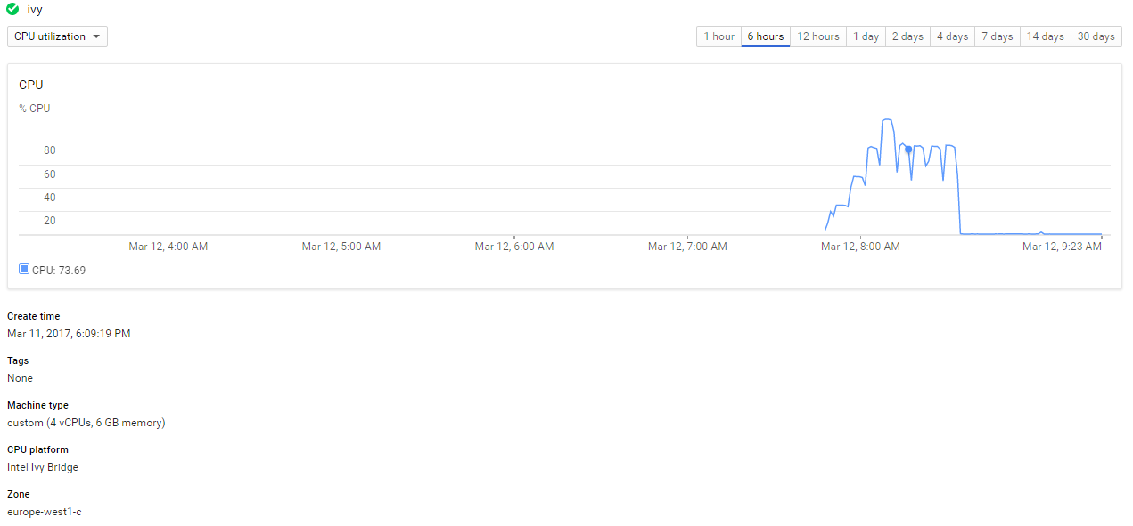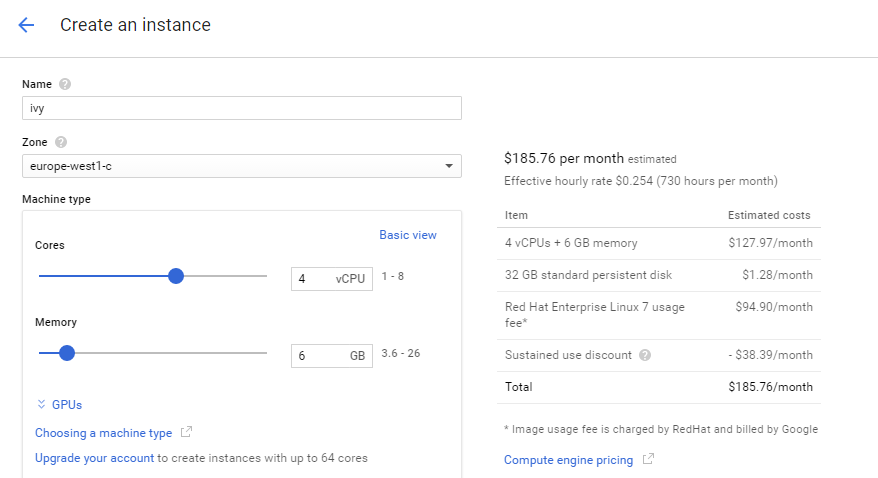 Here I choose europe-west1-c and created an VM running RHEL7 on 4 vCPU Ivy Brige: