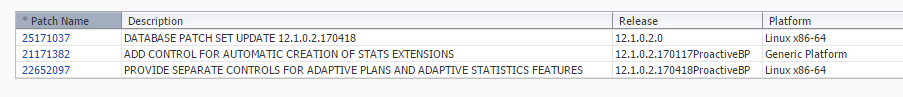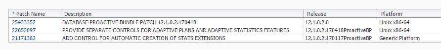p25755742_122010_Linux-x86-64.zip: 25397136 (DATABASE BUNDLE PATCH: 12.1.0.2.170418) p21171382_12102170117ProactiveBP_Generic.zip: 21171382 (ADD CONTROL FOR AUTOMATIC CREATION OF STATS EXTENSIONS) p22652097_12102170418ProactiveBP_Linux-x86-64.zip: 22652097 (PROVIDE SEPARATE CONTROLS FOR ADAPTIVE PLANS AND ADAPTIVE STATISTICS FEATURES)