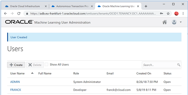 For this test I’ve created a new user in my Autonomous Transaction Processing cloud service.